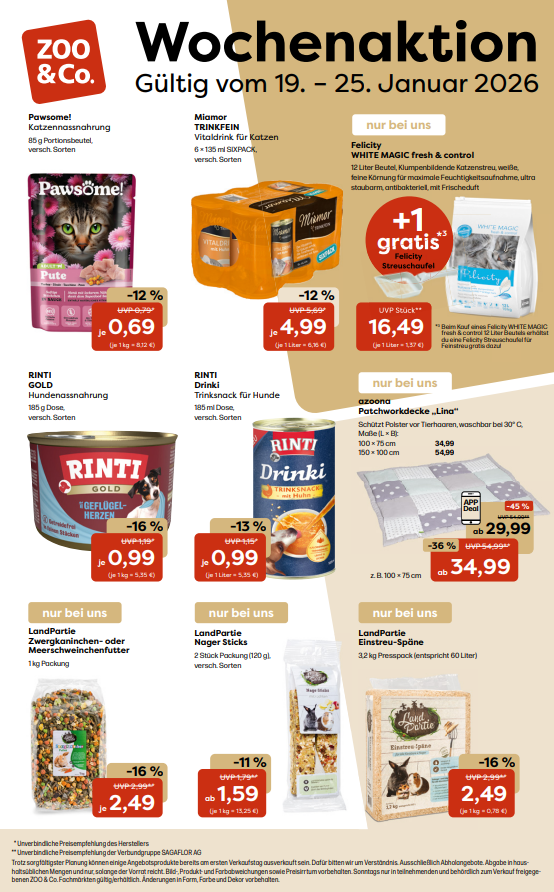 Trotz sorgfältigster Planung können einige Angebotsprodukte bereits am ersten Verkaufstag ausverkauft sein. Dafür bitten wir um Verständnis. Ausschließlich Abholangebote. Abgabe in haushaltsüblichen Mengen und nur, solange der Vorrat reicht. Bild-, Produkt- und Farbabweichungen sowie Preisirrtum vorbehalten. Sonntags nur in teilnehmenden und behördlich zum Verkauf freigegebenen ZOO & Co. Fachmärkten gültig/erhältlich. Änderungen in Form, Farbe und Dekor vorbehalten.